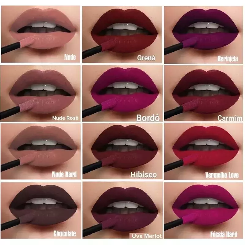 O Batom Líquido Matte Mahav conta com acabamento matte e longa duração. Com alta pigmentação, cobertura uniforme e sem manchas, você chega ao resultado desejado na primeira aplicação. Fácil de aplicar. Possui textura líquida, essência de uva, cores incríveis, acabamento fosco e uma cartela com 12 cores perfeita para compor os mais diversos looks e composições.